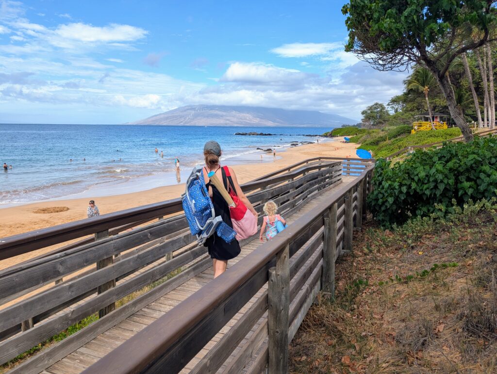 We started the day out walking to the beach in front of our condo, Kamaole III, to enjoy some sand and sun. The water was a little choppier today, but still calm enough that I felt comfortable swimming. While we were setting out our beach stuff we saw a turtle in the water lazily swimming by. This made Ayla excited to go in and hopefully see turtles underwater. She put on all her ocean ware and was ready to explore. When we first went out she was a little taken aback by the choppier water, but quickly started to relax and became willing to go under. We had one turtle swim by us, but it was too far out for us to feel comfortable to take Ayla, but she did see it pop its head above the surface. Then we had another one swim by closer to the beach, but it was going fast enough that by the time Ayla even located it, it wasn’t able to be seen underwater. Then, all the stars aligned and we had a HUGE turtle swim directly under her. We honestly didn’t even see it until AJ said his foot hit something hard, we were treading water, so we looked down thinking we had drifted over a rock and sure enough it was a turtle. The turtle was directly under Ayla! She was scared by the sheer size of it and just wanted me to hold her at first. But then she wanted to see it underwater and it was still close enough that she was able to see it! She was so excited! When AJ got out of the water he had a nice little cut on his foot, not enough to draw blood or anything, but it just shows how sharp the shells can be. We saw a few more turtles before we left the beach, but they really had no personal boundaries, they were swimming pretty close to a lot of the swimmers.