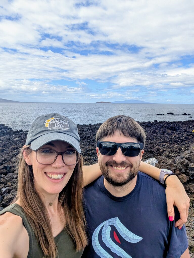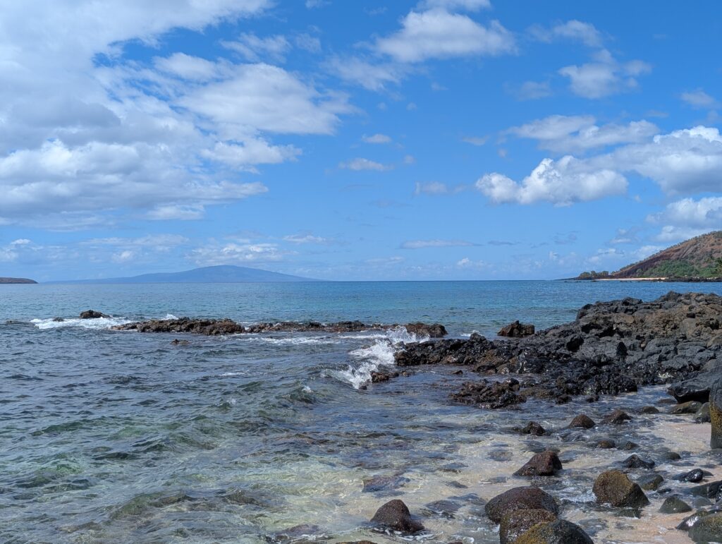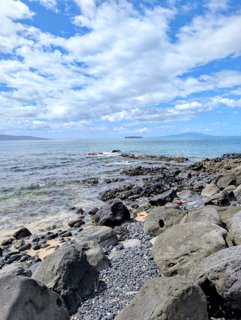 We landed at 10am local time, so we were excited to take advantage of the day. We headed to Kanahena Natural Area Reserve [The ‘Āhihi-Kīna‘u reserve] first thing. This is a part of Maui we have always wanted to explore but we’ve never made the time for it – so today was the perfect day to make the time. The drive there was nice; it reminded us a lot of the lava areas on the Big Island. The Natural Area has a trail that leads to outlets that are known for snorkeling, but are considered more advanced waters. The views from the trail leading to the water were gorgeous. Once we finished our little hike there we continued onto the road to the La Perouse Memorial, which is located in La Perouse Bay at the end of Makena Alanui Road. Along the whole road of the reserve is a tall chain-link fence. We kept wondering what they were trying to keep out. Well, on our way out of the reserve, we got out answer – GOATS! We saw our first Maui wild goat. It was awesome – had horns and all! Heading back into town, there were several little pullouts along the road that allowed you to enjoy little sand areas with expansive views. We made a couple stops to get our toes in the sand and enjoy some splashes from the waves.