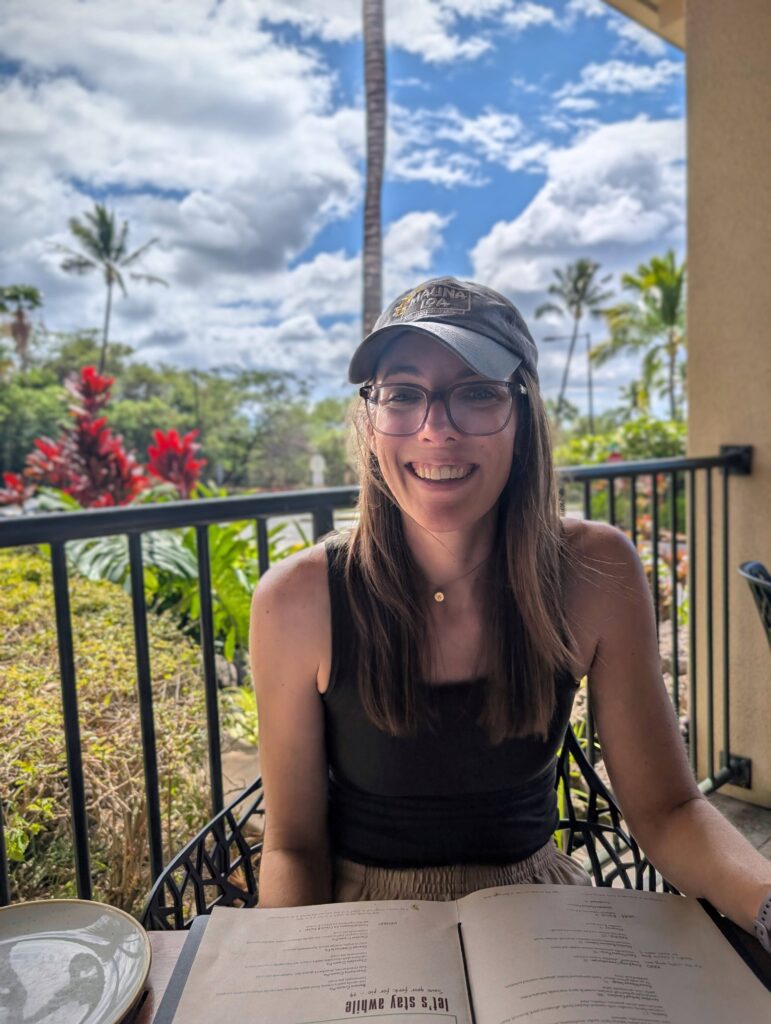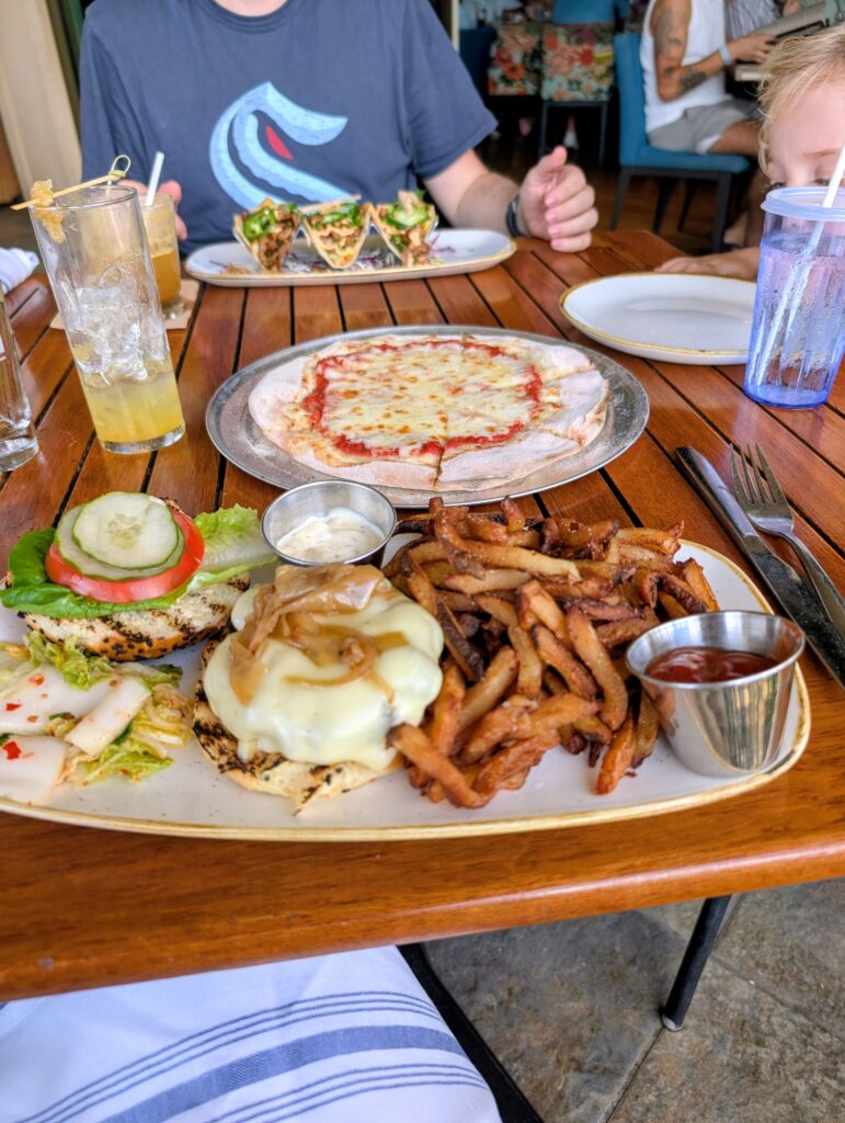 After our exploring, we headed to Monkey Pod – our favorite! However, we’ve only gone outside of happy hour times once or twice in our 11 years coming here. So, we figured we’d order a real meal and see how it compared to our normal fare. We of course got Mai Tai’s; I also tried the Cat’s Pajamas (ginger, lemon, turmeric, honey & orange). Having just come off being under the weather I figured it would be a good drink to start the vacation. If you like ginger, I highly recommend it. For food we got a cheese pizza for Ayla, Maui Cattle Company cheese burger with fries and the Bulgogi Pork Tacos. All the food was good, but their happy hour offerings remain the winners in our minds.